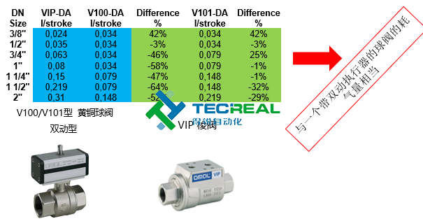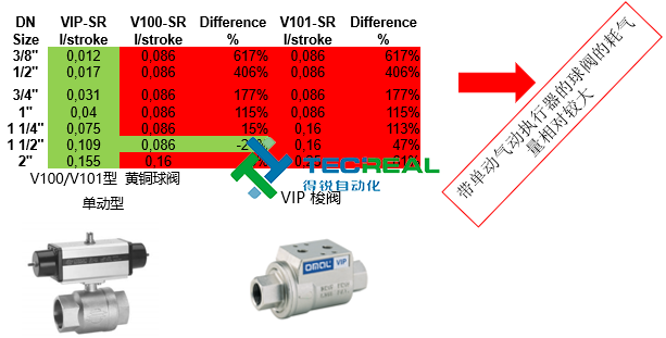 再看看VIP梭閥在耗氣量上與V101氣動(dòng)球閥相比有何差距。從測(cè)試的結(jié)果上來(lái)看,梭閥在耗氣量上與一個(gè)帶雙動(dòng)執(zhí)行器的球閥耗氣量相當(dāng)。