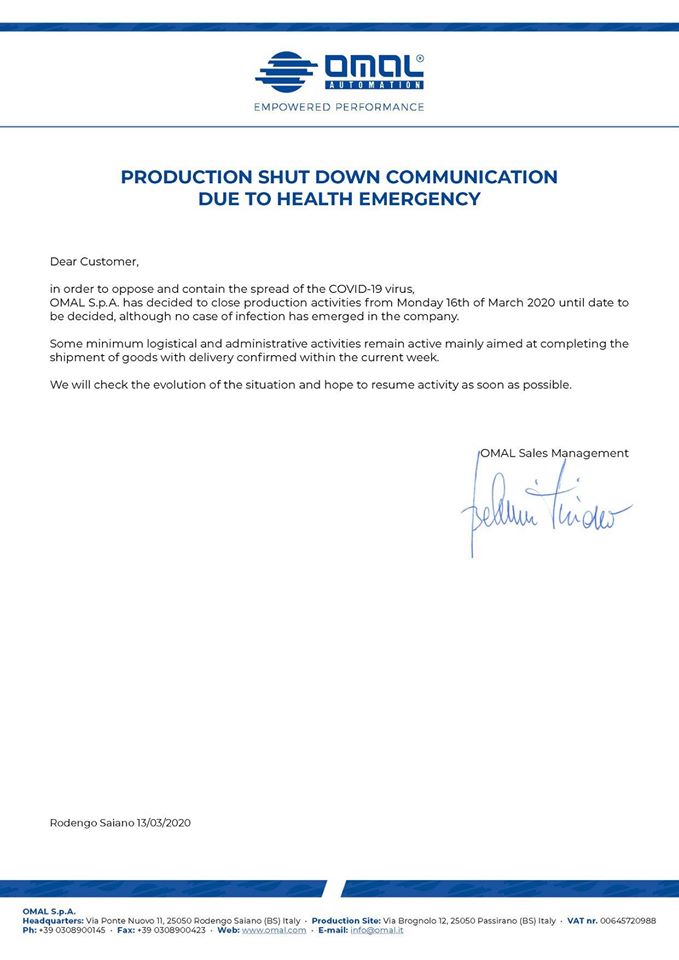 3月13日,OMAL正式宣布,為了員工身體安危,響應意大利政府號召,關(guān)閉產(chǎn)品生產(chǎn)線。