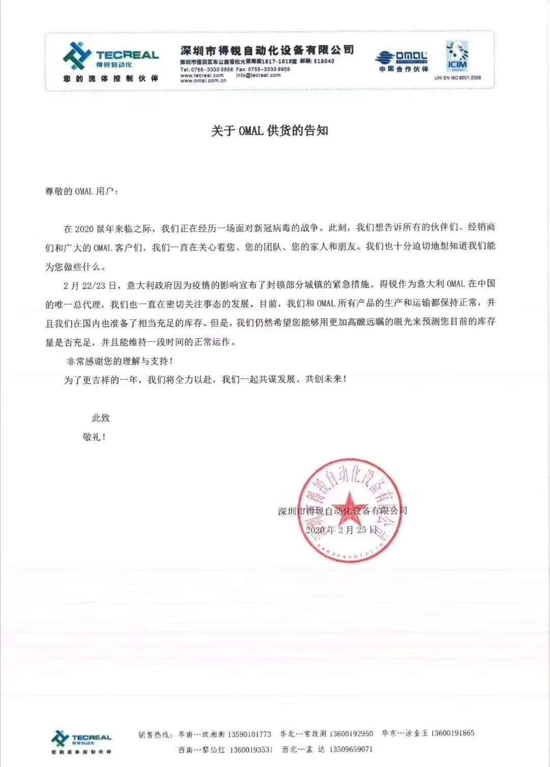 得銳自動化作為意大利「OMAL.S.P.A」公司在國內(nèi)的總代理,一直關(guān)心著意大利疫情的發(fā)展。![]()