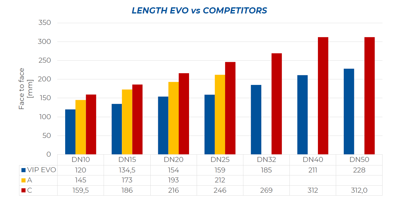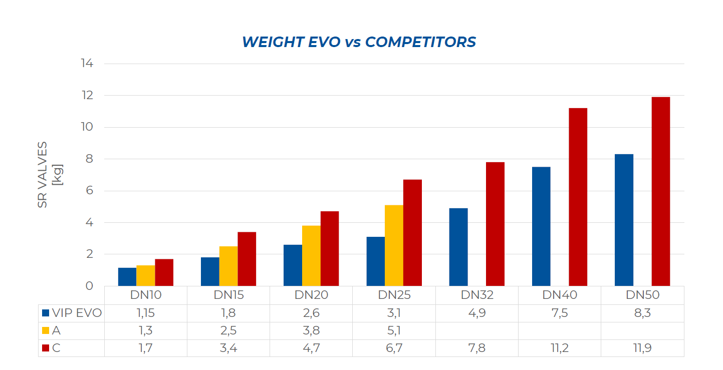 在下圖中與競(jìng)爭(zhēng)對(duì)手產(chǎn)品的對(duì)比中,VIP EVO閥門(mén)在體積和重量上都是完勝對(duì)手。