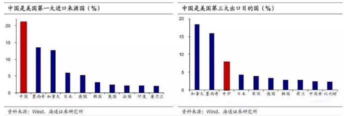 首先,我們從大的方面講。據(jù)2016年的數(shù)據(jù),中國(guó)是美國(guó)的第三大出口目的國(guó),也是美國(guó)的第一大進(jìn)口來(lái)源國(guó)。對(duì)中國(guó)而言,美國(guó)是中國(guó)的第一大出口目的國(guó),占中國(guó)總出口的18.5%,也是中國(guó)第六大進(jìn)口來(lái)源國(guó)。