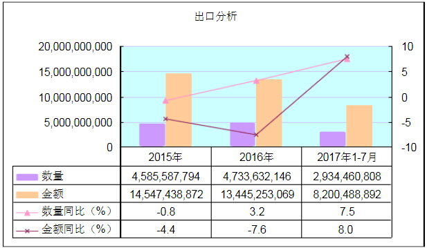 在2015-2016年度,我國(guó)閥門(mén)出口總量從45.85億套/千克增長(zhǎng)到47.33億套/千克,增長(zhǎng)了3.2%;2017年1-7月,我們閥門(mén)出口總量為29.34億套/千克,比上年同期增長(zhǎng)7.5%。