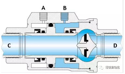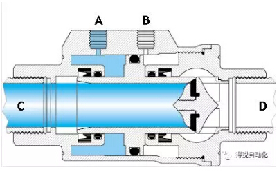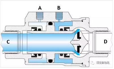當(dāng)“A”孔進(jìn)氣(“B”孔排氣)時(shí),活塞向“D”口移動(dòng)并壓在閥座密封上,此時(shí)閥門(mén)關(guān)閉。單動(dòng)常閉型的彈簧安裝在“A”端腔室。在非控制時(shí),活塞是壓在閥座上,所以其最常用的是關(guān)閉位。